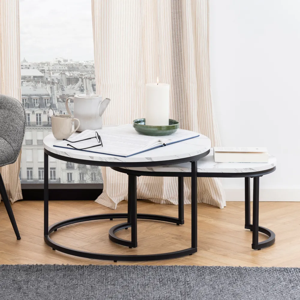 Samen of apart, maakt niet uit. Deze salontafelset ziet er hoe dan ook prachtig uit. Het unieke tafelblad heeft een wit marmeren uitstraling en brengt een vleugje luxe in het dagelijks leven. In combinatie met het zwarte metalen frame voelt het ontwerp rijk aan omdat beide elementen elkaar completeren. Het feit dat de ene tafel rond is en de andere pilvormig, maakt de set nog interessanter.