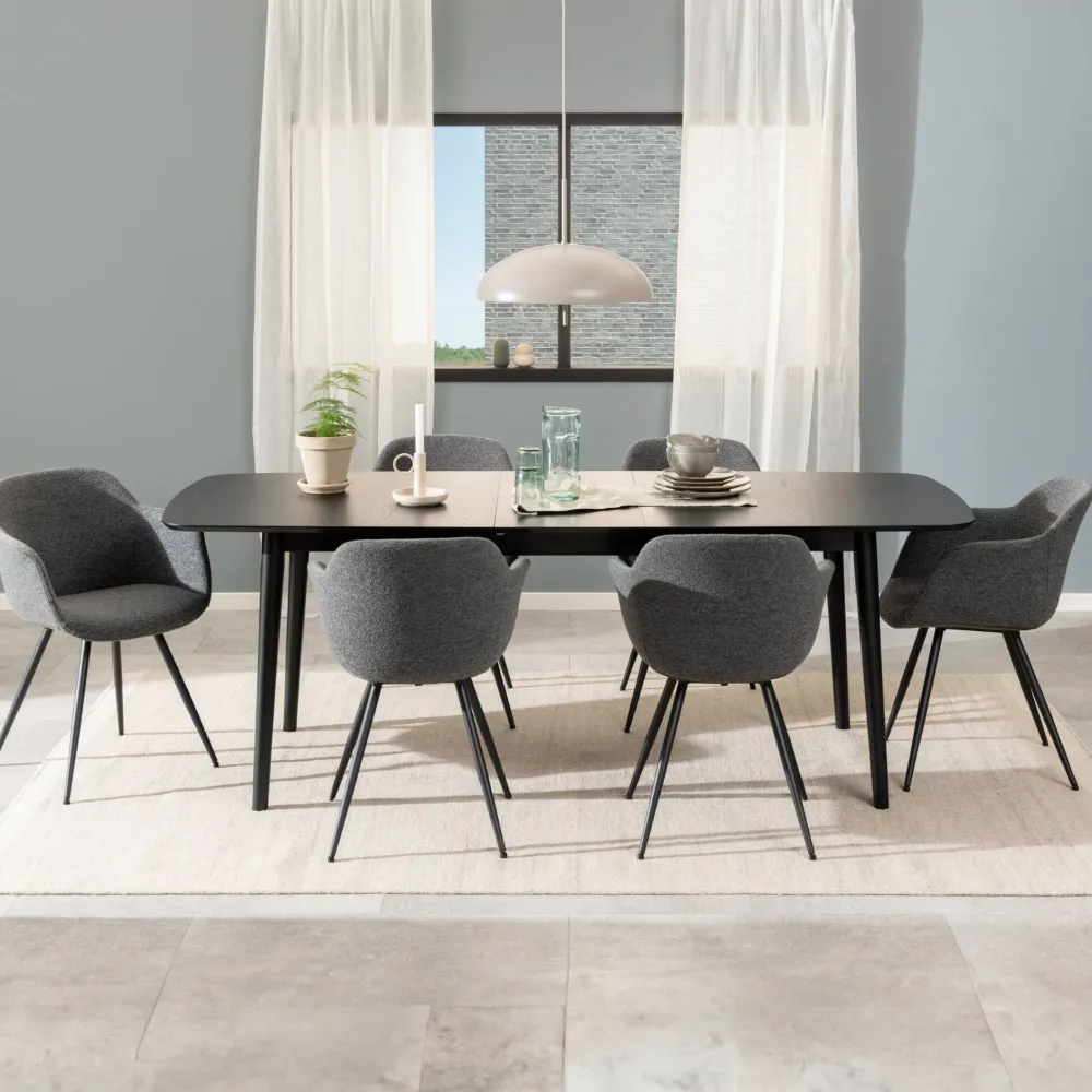 Maak kennis met een eettafel die er goed uitziet en veel ruimte biedt. Gedefinieerd door een rechthoekige vorm, zachte randen en zwarte eiken look, maakt deze eettafel elke maaltijd spannender. Dankzij de vlinderverlenging kan het gelakte eikenfineer oppervlak eenvoudig worden uitgeschoven. Het is een eenvoudig mechanisme dat niet veel tijd en moeite kost.