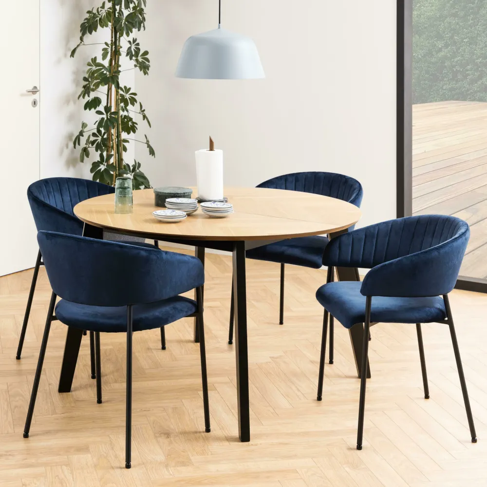 De ronde tafel is uitschuifbaar door middel van twee verlengstukken die in het midden kunnen worden geplaatst. Zo maak je in een handomdraai van een ronde een ovale tafel. Het rubberhouten onderstel is matzwart gelakt en vormt een mooi contrast met het lichte blad. De tafel past perfect in een Scandinavisch plaatje. Zet er een aantal stijlvolle eetkamerstoelen omheen en de look is compleet.