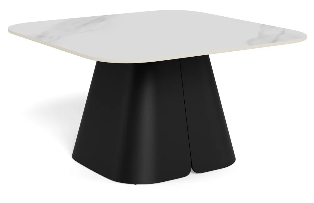 Deze salontafel is gebouwd op contrast en heeft een vierkant wit blad met afgeronde hoeken, zittend op een zwarte pilaar. Het slanke blad is gemaakt van keramiek – een hitte- en krasbestendig materiaal, versierd met subtiele aderen. Met een robuuste kolomvoet van zwart staal heeft de tafel een stevige basis. Het is een stuk voor mensen die houden van gedurfd, expressief design.