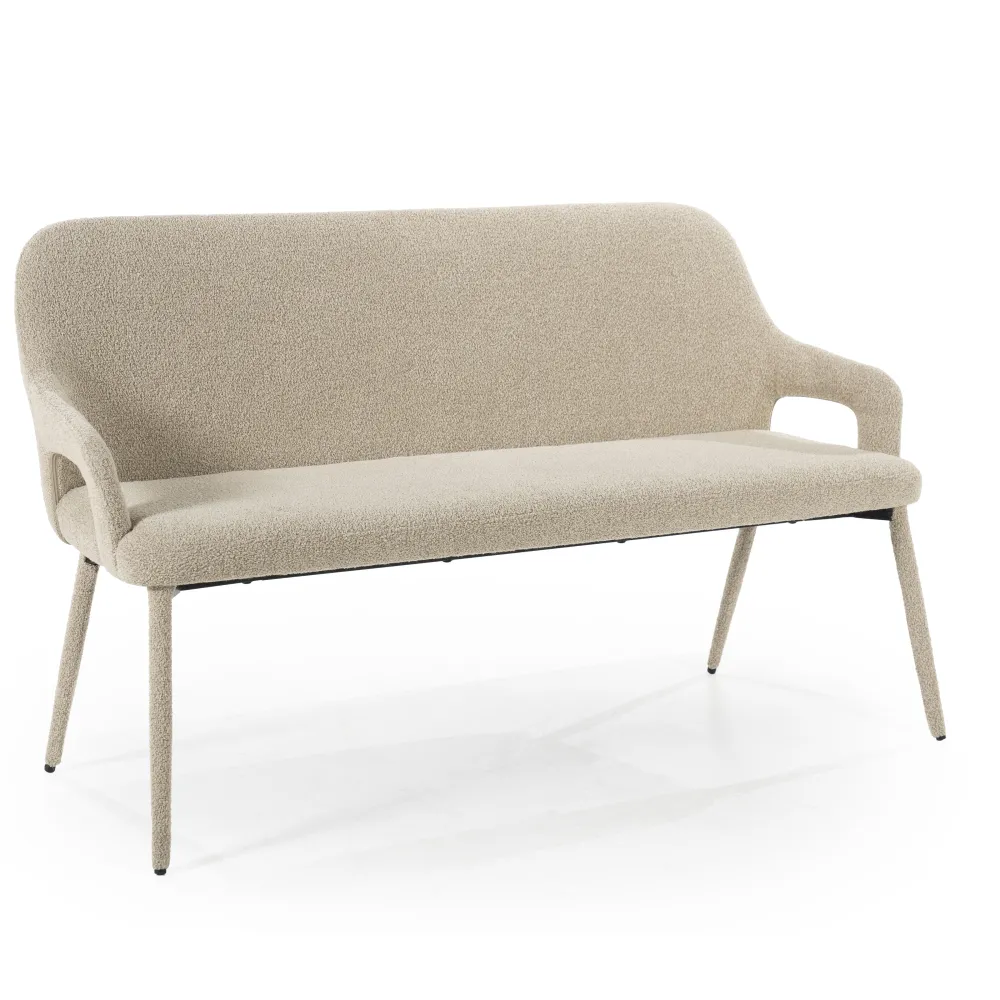 Het trendy design van de ‘Fika’ maakt het een echte eyecatcher in je interieur. De bouclé stof geeft een warme, zachte uitstraling, terwijl het volledig gestoffeerde frame zorgt voor een harmonieuze, strakke look. Dankzij de hoge rugleuning en armleuningen voelt de bank als een comfortabele cocon, ideaal voor ontspannen momenten met vrienden en familie. Of je nu een ruimtelijk statement wilt maken of een gezellige hoek wilt creëren, de eetkamerbank van By-Boo brengt stijl, comfort en verfijning samen in één uniek meubelstuk.