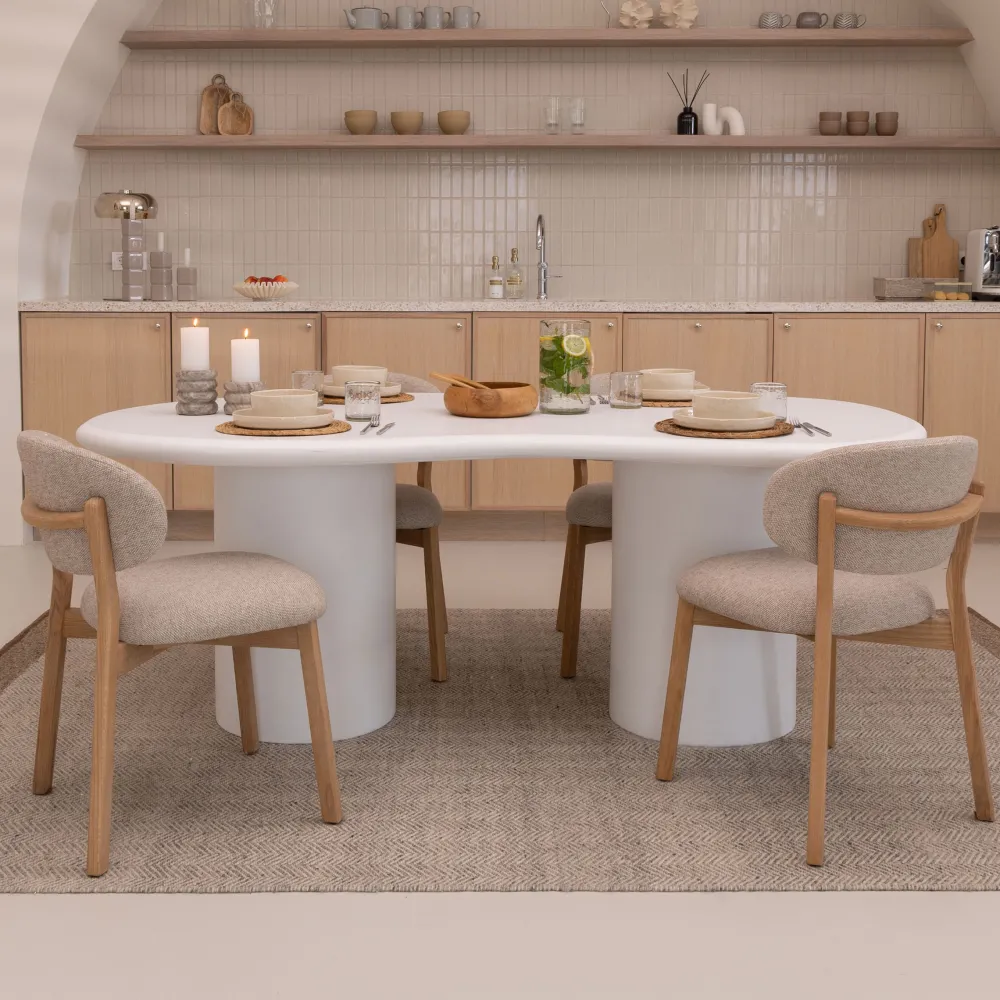 De organische eettafel ‘Seki’ van By-Boo is een unieke en moderne eyecatcher in jouw interieur. Met zijn speelse, organische vorm brengt deze tafel een dynamische uitstraling in je eetruimte. De tafel is uitgevoerd in stijlvol wit en vervaardigd uit een combinatie van magnesium oxide en glasfiber, wat zorgt voor een stevige, maar lichte constructie.