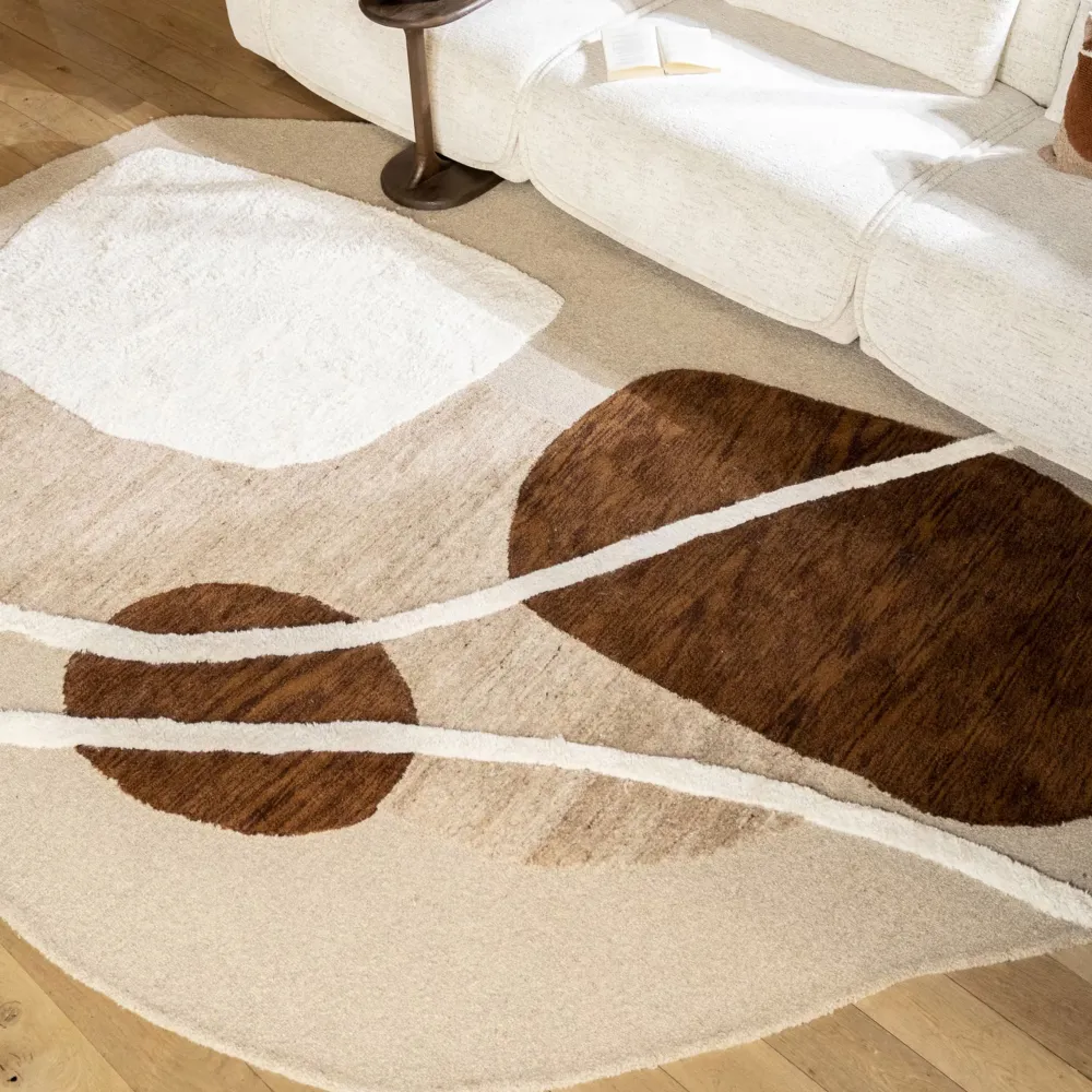 Het organisch vloerkleed Ogani van By-Boo is een kleurrijke wollen blikvanger voor je interieur. Met verschillende vormen en tinten zoals beige, off-white en bruin, brengt het kleed een speels en warm effect in elke ruimte. Door deze kleuren terug te laten komen in je interieur, bijvoorbeeld met kussens op de bank of andere accessoires, creëer je een harmonieus en samenhangend geheel.