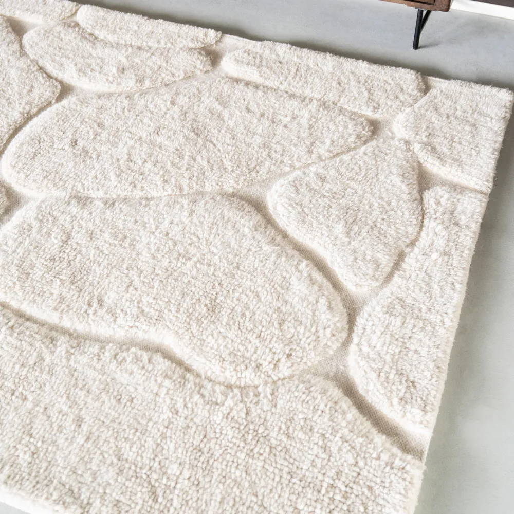 Het vloerkleed Kala van By-Boo is gemaakt van 90% wol en 10% katoen, wat zorgt voor een heerlijk zachte en duurzame kwaliteit. De off-white kleur met speelse vlakken geeft het kleed een subtiel maar interessant patroon, dat direct karakter toevoegt aan je interieur. Perfect in een Scandinavisch licht interieur, waar het zorgt voor warmte en textuur zonder te overheersen.