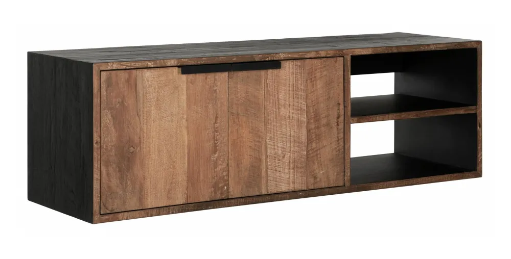 Hangend TV meubel Cosmo combineert naturel en zwart teakhout en is hiermee een opvallende verschijning. De afmetingen van het meubel zijn 40x125x40 cm met 2 deuren en 2 open vakken.