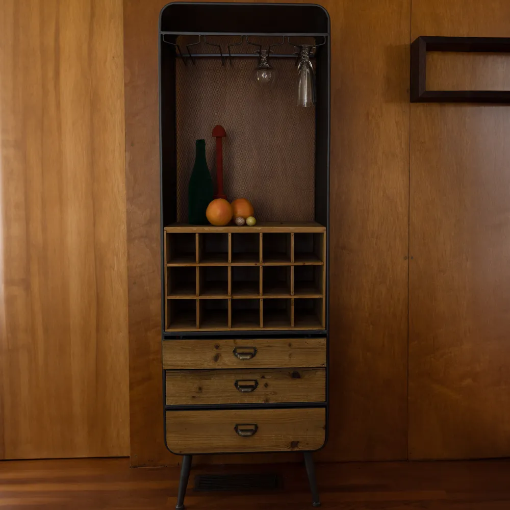 De wijnkast Vino van Dutchbone is een robuust en stijlvol meubelstuk, vervaardigd uit massief dennenhout met een antieke finish en afgewerkt met een rustiek ijzeren frame en rooster aan de achterzijde. De kast biedt drie lades voor accessoires, 15 vakken voor wijnflessen en een rek om wijnglazen op te hangen, waardoor alles overzichtelijk en netjes wordt opgeborgen.