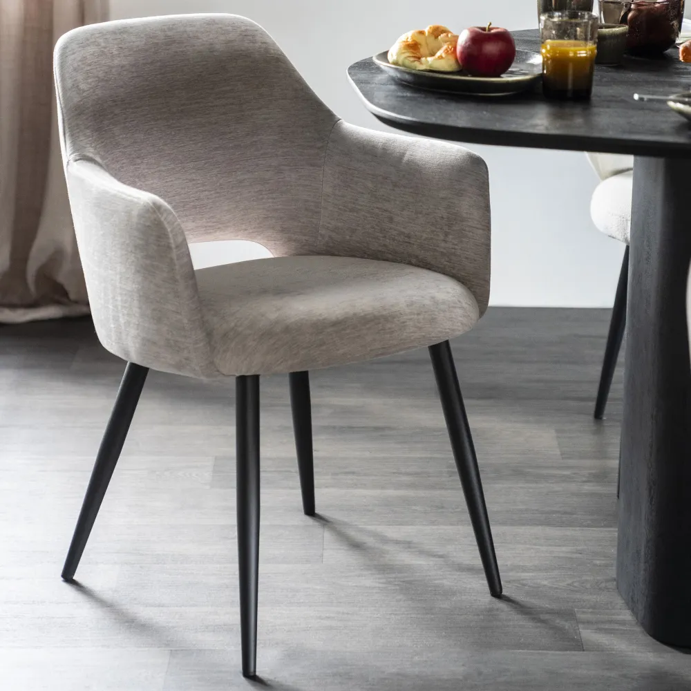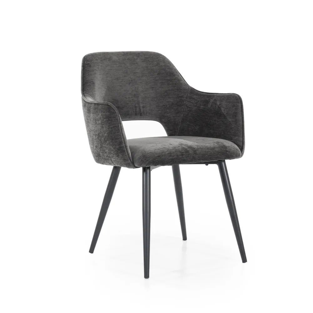 Sfeervol, classy en comfortabel is ‘Esmee’. Deze stoel heeft een stoffen (polyester) zitting die de rug en armen goed ondersteunt. Het onderstel is van metaal, dus veel onderhoud hebben de poten niet nodig. ‘Esmee’ is perfect voor een gezellige spelletjesavond, een lekker lang diner of een snel ontbijt, want de zitting zorgt ervoor dat je het liefst aan tafel zit.
