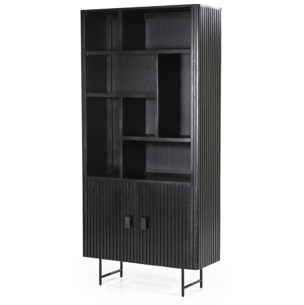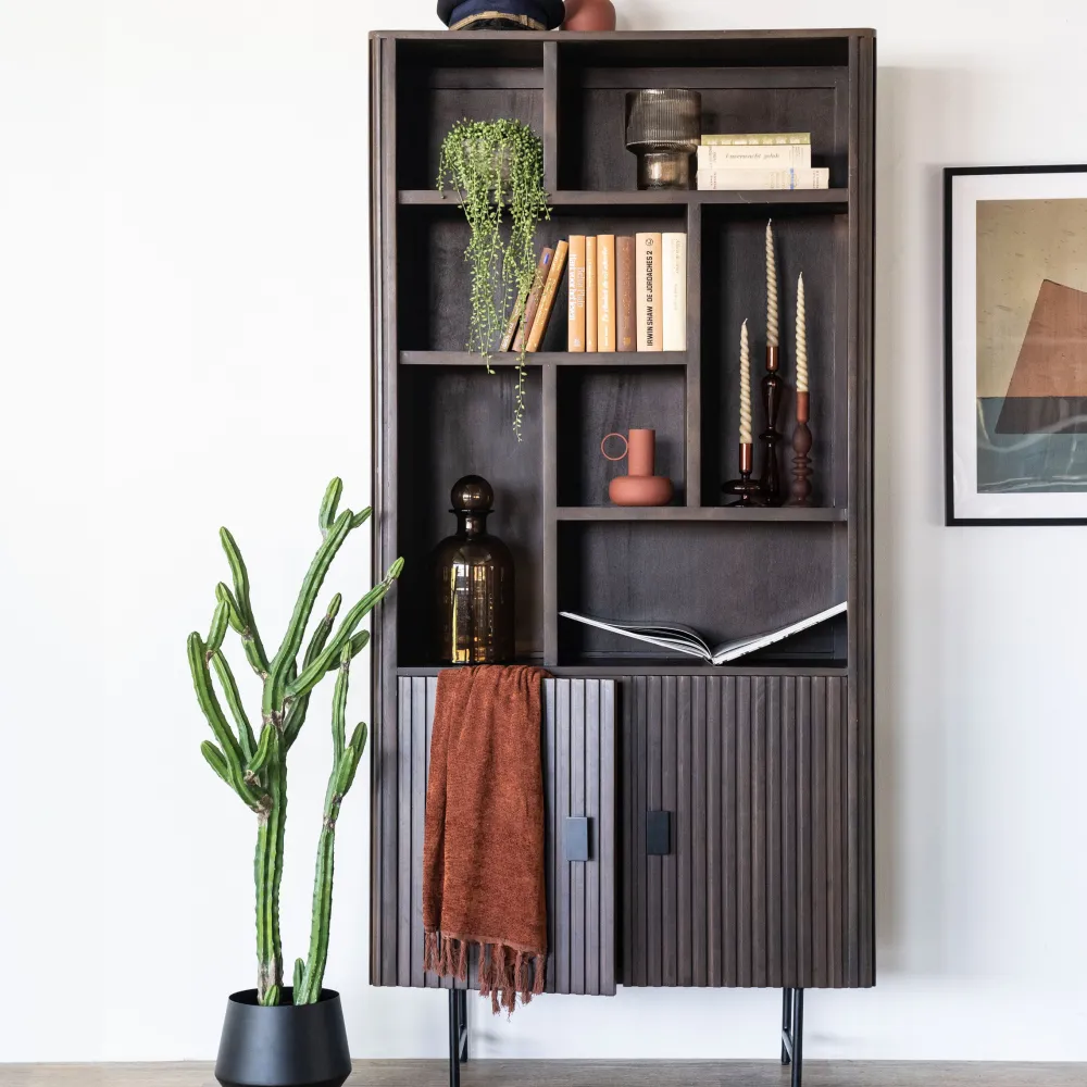 Boekenkast Remi van Eleonora is een stoere en stijlvolle toevoeging aan je interieur. Het gecoate mangohout in een warme diepbruine kleur geeft de kast een luxe en tijdloze uitstraling. Het metalen onderstel en de handvaten zorgen voor een krachtig accent, terwijl de speelse indeling van de vakken een verrassend geheel vormt.