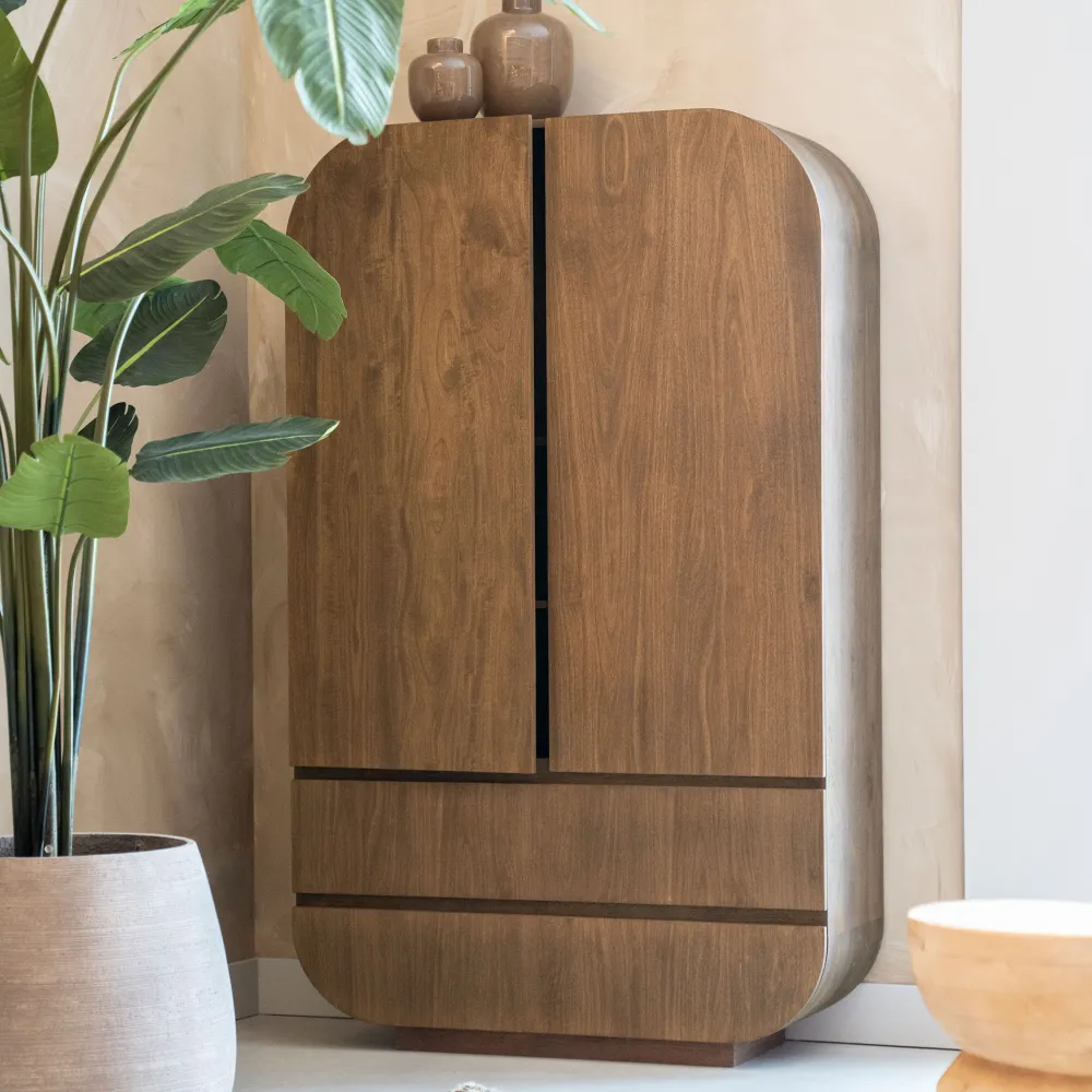 De King opbergkast van Eleonora is een krachtig meubel met een warme uitstraling. Gemaakt van geborsteld mangohout toont de kast een rijke houtstructuur en een stoer karakter. Het ontwerp is verzacht met afgeronde hoeken, wat zorgt voor een vriendelijk en evenwichtig silhouet.