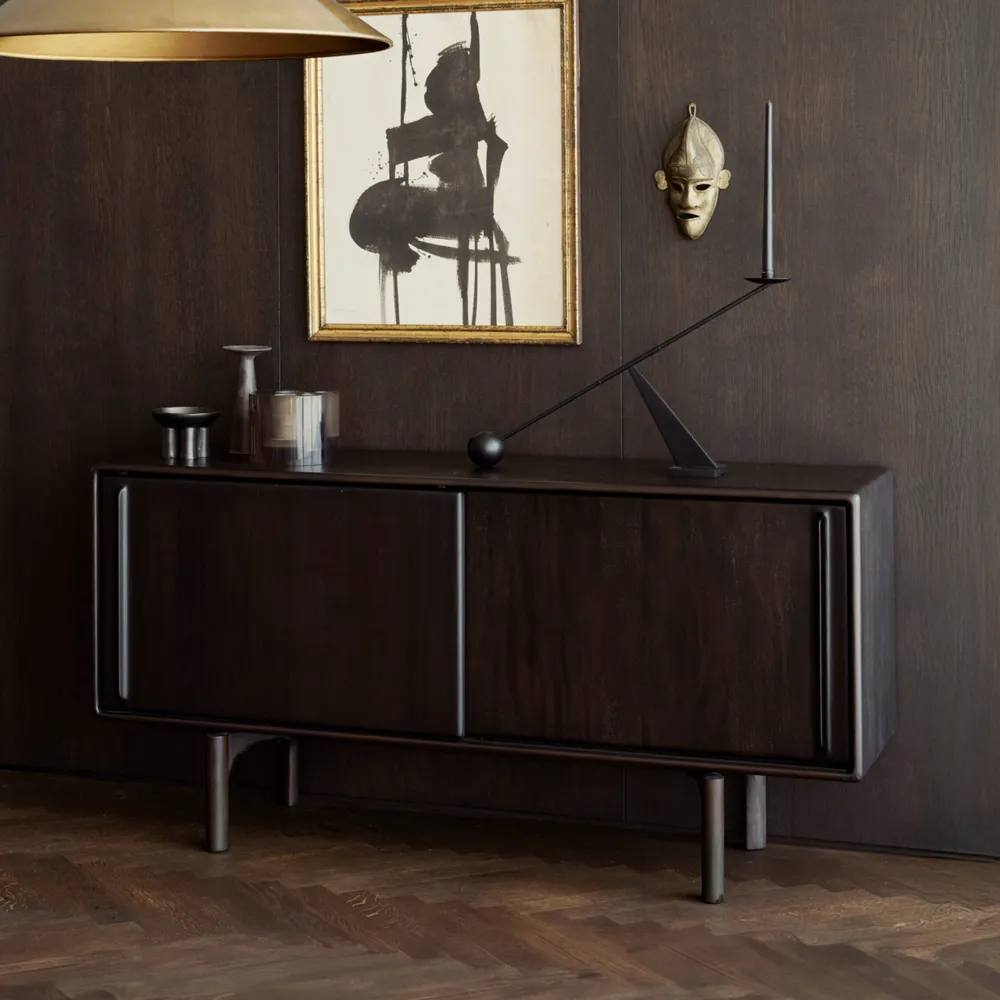 De Flow-collectie geeft een gevoel van beweging door de zachte randen en vloeiende lijnen. Met zacht afgeronde hoeken en subtiele rondingen straalt elk stuk een vintage gevoel uit met een verfijnde, moderne houding – ideaal als aanvulling op veranderende ruimtes en behoeften. Het dressoir biedt met zijn royale bovenblad en interne legplanken praktische opbergruimte. Gemaakt van massief mahoniehout en afgewerkt met een rijke lak die de natuurlijke houtnerf accentueert, rust het op karakteristieke poten die zorgen voor een lichte, verheven uitstraling van dit functionele klassieker.