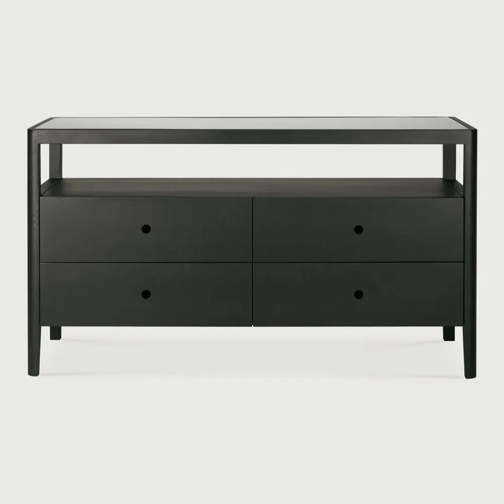 De Spindle collectie vond zijn inspiratie in het traditionele spinnewiel. De licht taps toelopende poten en afgeronde hoeken geven een zachte, sensuele uitstraling aan deze prachtige slaapkamercollectie. Dit dressoir voelt zich net zo goed thuis in de slaapkamer als in commerciële ruimtes als een stijlvolle opberger.