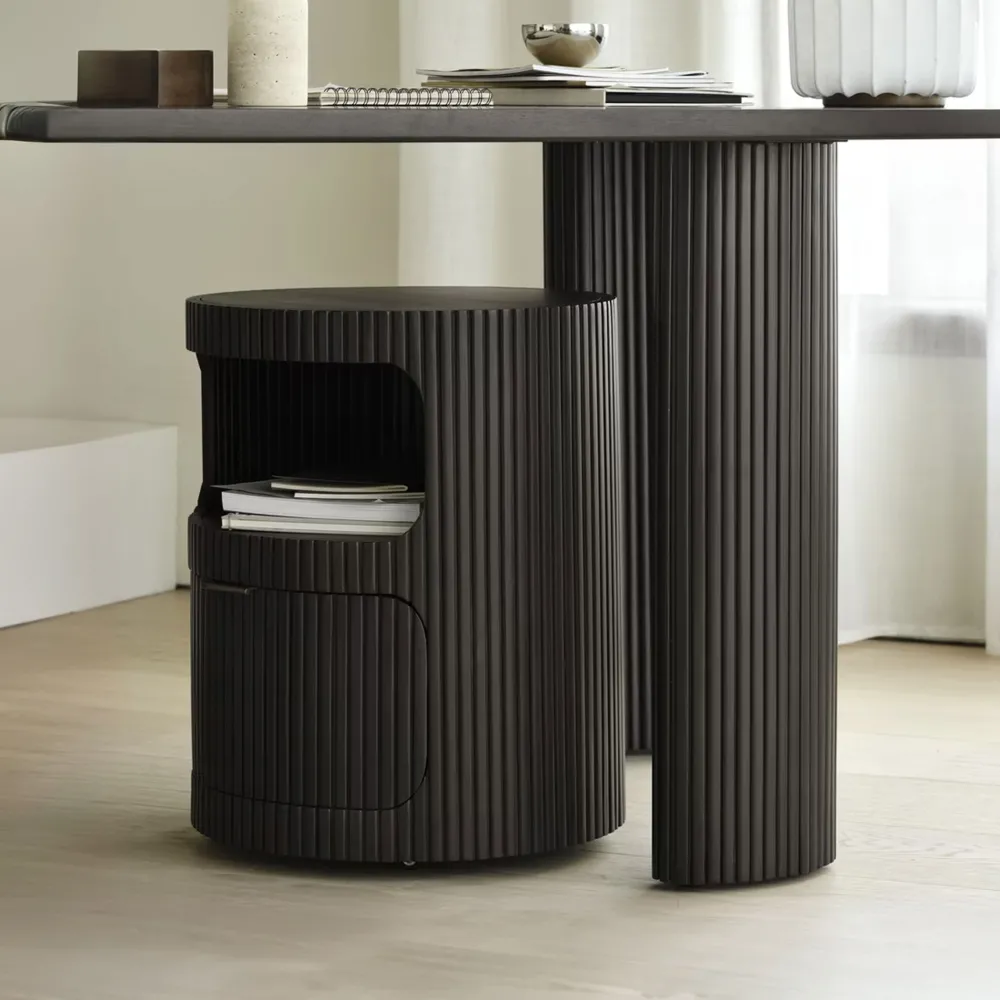 De Boomerang collectie is geïnspireerd op vormen in de natuur en heeft een speels, kiezelachtig tafelblad op gebogen poten met geritmeerd houten effect. Het ladekast Boomerang, met handgesneden details en handige wielen, kan voor veel doeleinden worden gebruikt en past perfect onder een bureau voor extra opbergruimte of als een op zichzelf staand meubel.