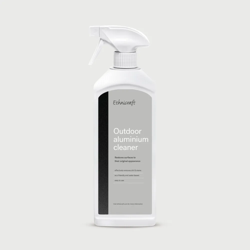 Om het uitzicht van uw Ethnicraft Outdoor-meubilair in aluminium te bewaren, raden we aan om de Outdoor Aluminium Reiniger te gebruiken. Deze formule is speciaal ontworpen om vuil en vlekken veilig te verwijderen en de originele afwerking van oppervlakken te herstellen. Ethnicraft Outdoor Aluminium Reiniger is gemakkelijk in gebruik, milieuvriendelijk en op waterbasis, en zorgt ervoor dat uw meubilair met een minimum aan inspanning schoon en fris blijft. Gebruik in combinatie met Ethnicraft Outdoor Aluminium Beschermer voor een optimaal onderhoud.