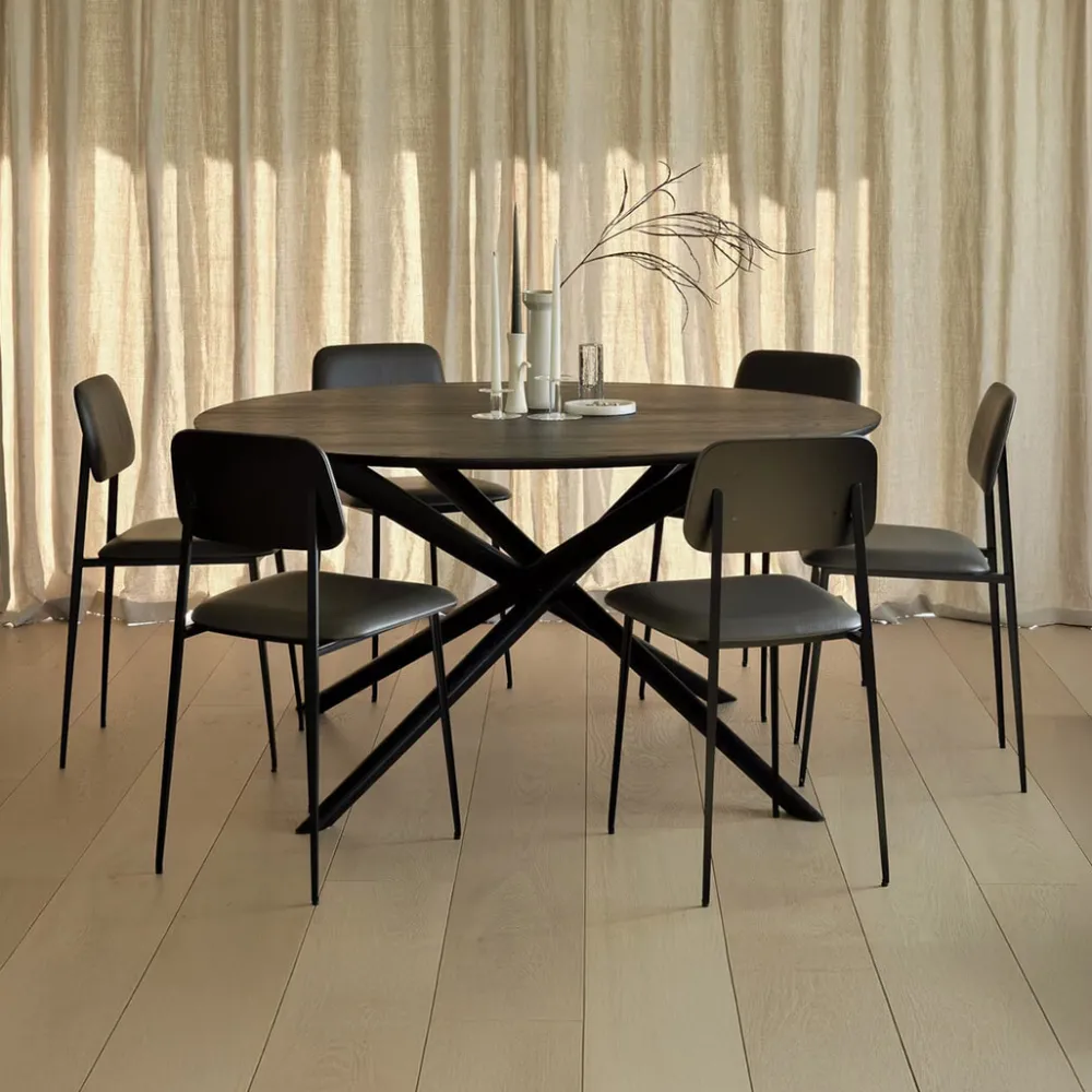 Het sculpturale karakter van de Mikado eettafel is het resultaat van een zoektocht naar een balans tussen functionaliteit en stabiliteit. De poten passen in elkaar als een goed doordachte puzzel onder een stevig rond tafelblad. Ontworpen door Alain van Havre.