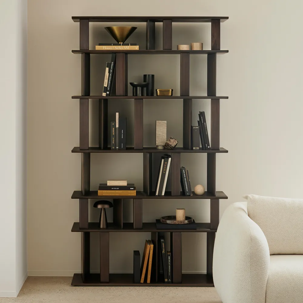 Een ritmisch samenspel van vorm en functie: het Block-rek voegt een sculpturaal accent toe aan alledaagse opbergruimte. Gemaakt van massief mahoniehout, zorgen de hoekige verdelers voor een dynamisch lijnenspel vanuit elke hoek – of het rek nu op zichzelf staat of in serie wordt geplaatst. Met zijn strakke lijnen en open structuur combineert het Block-rek visuele spanning met praktische bruikbaarheid.