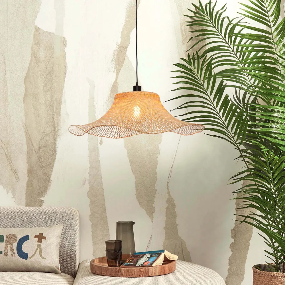 Merk:GOOD&MOJOMateriaal:Bamboe en ijzerBreedte:65cmHoogte:20cmDiepte:65cmType fitting:E27Dimbaar:Ja, deze lamp is geschi…
