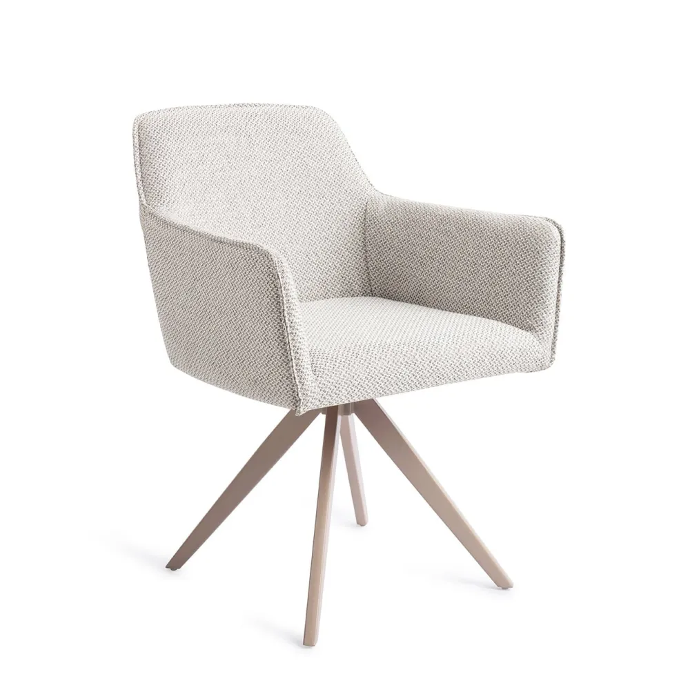 De zitting van de Hofu stoel is bekleed met hoogwaardige polyester stof in een grove weving en is verkrijgbaar in zes prachtige kleurtinten: Potters Clay (bruin), Wild Walnut (lichtbeige), Checkers Charme (lichtgrijs), French Toast (donkerbeige), Enoki (crème) en Violet Daisy (paars). De grove weving voegt diepte en textuur toe aan deze kleuren. Elke kleur is zorgvuldig geselecteerd om je te helpen een harmonieuze sfeer te creëren die jouw interieurstijl weerspiegelt.