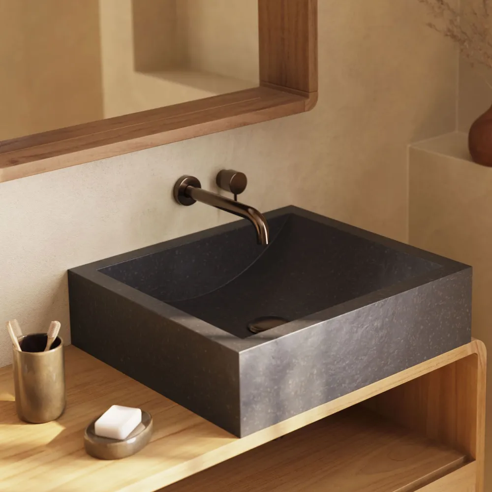 Maak je badkamermeubel compleet met de Kuweni opzetwastafels, gemaakt van duurzaam terrazzo, en ontspan in een design-spa in Aziatische stijl zonder je huis te verlaten.