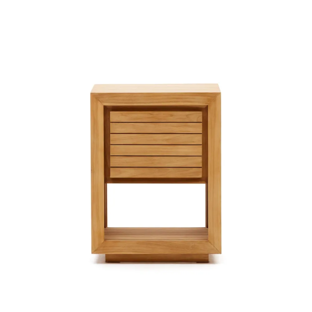- Badkamermeubel in massief teakhout met natuurlijke afwerking en één deur.