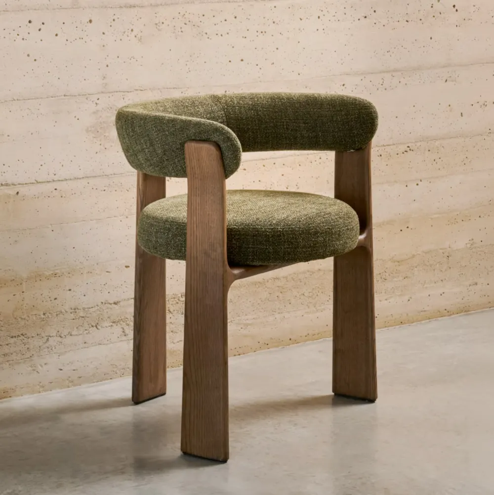 - Stoel bekleed in chenille met gerecycled polyester met een grove structuur in tweekleurig beige.