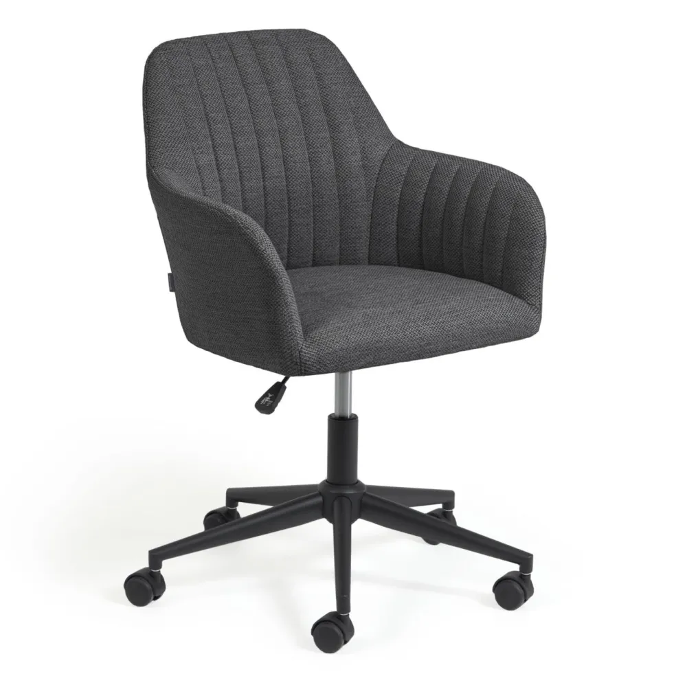 - Draaistoel met verstelbare hoogte, een matzwart stalen frame en wielen die geschikt zijn voor houten vloeren.