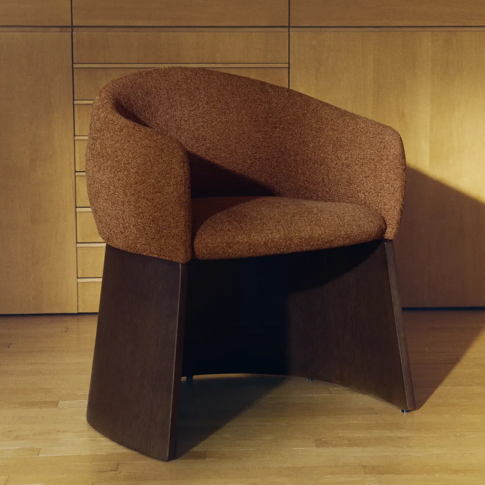 Deze stoel valt op door zijn evenwichtige ontwerp, met een brede, comfortabele zitting die rust op een houten onderstel dat is bedekt met walnootfineer. De matte polyurethaanafwerking beschermt het oppervlak en geeft het geheel een warme uitstraling. Bovendien is het hout met FSC™ 100% Chain of Custody-gecertificeerd met een garantie voor een model van verantwoord bosbeheer. De bekleding is gemaakt van chenille met een fijne structuur: voelt zacht aan, is bestand tegen dagelijks gebruik en gemaakt van 100% gerecycled polyester van een Global Recycled Standard-gecertificeerde leverancier. De stof heeft een waterafstotende behandeling ondergaan en is OEKO-TEX® STANDARD 100-gecertificeerd wat een ecologisch veilige en milieuverantwoorde productie garandeert. De zitting is van gemiddelde hardheid dankzij de combinatie van banden en veren met injectieschuim met een dichtheid van 55 kg/m³, waardoor zijn stevigheid en vorm na verloop van tijd behouden wordt. Bovendien zijn de poten voorzien van vilten beschermers om markeringen en krassen op de vloer te voorkomen. Een meubelstuk dat ontworpen is om lang mee te gaan, en functioneel is in zowel huishoudelijke als commerciële ruimtes.