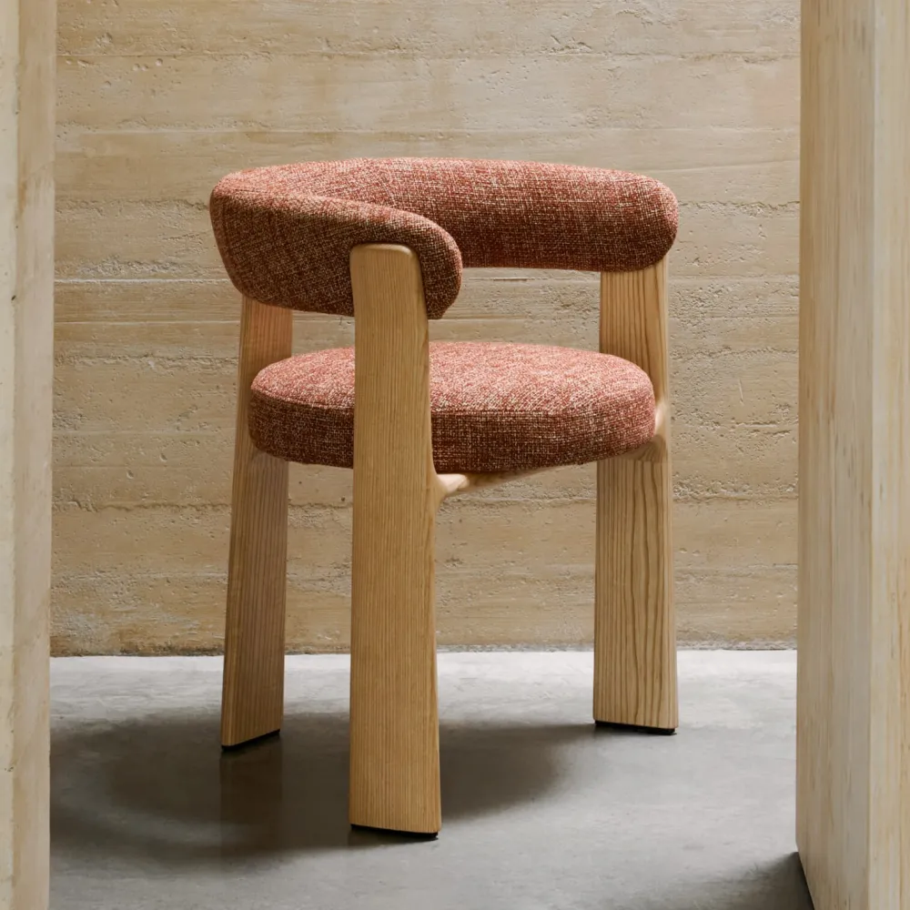 - Stoel bekleed in chenille met gerecycled polyester met een grove structuur in tweekleurig beige.