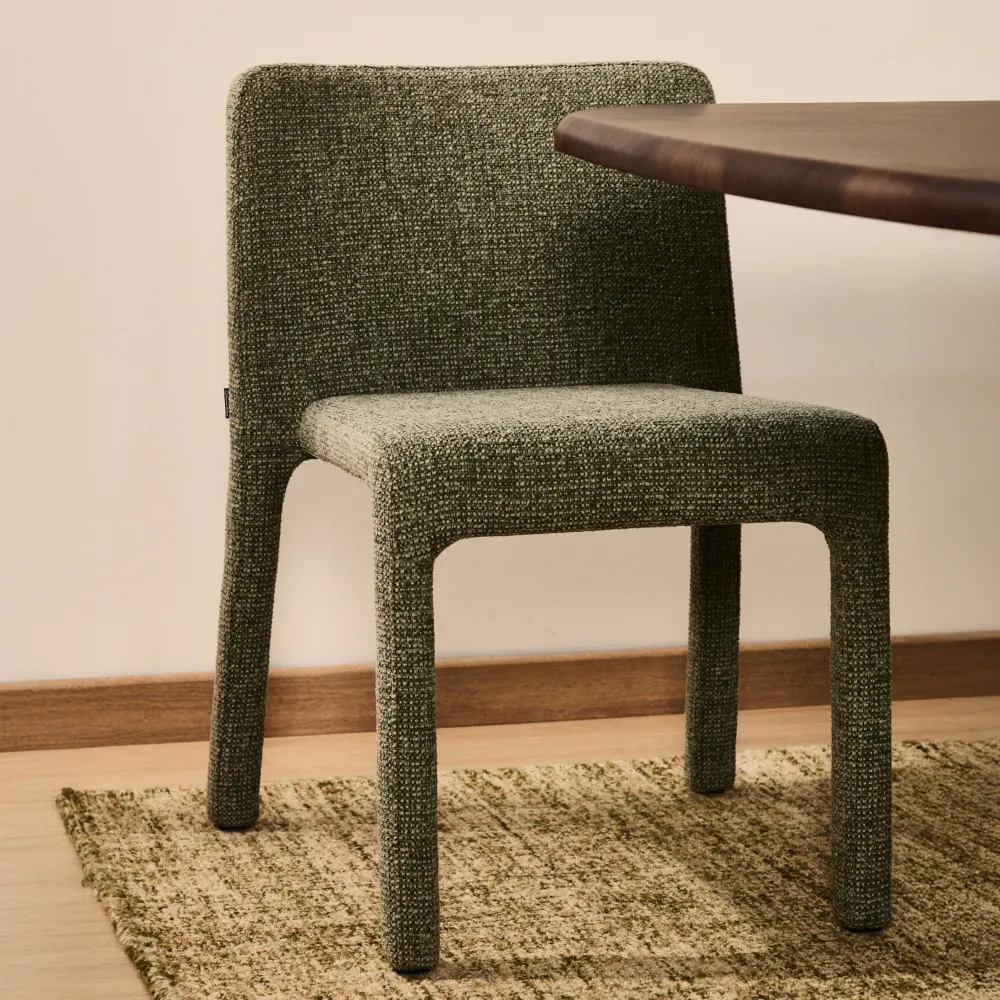 Met zijn stijlvolle ontwerp en verfijnde volumes past deze beklede stoel elegant en discreet in allerlei soorten ruimtes. De lichte en evenwichtige vorm straalt eenvoud en originaliteit uit, waardoor het een veelzijdig meubelstuk is dat zich gemakkelijk aanpast aan zowel huiselijke als professionele omgevingen. Dankzij de interne structuur van multiplex en injectieschuim met een dichtheid van 55 kg/m³ is de zitting stevig, comfortabel en gelijkmatig. Hij is functioneel en bestendig, maar onderscheidt zich ook door zijn lichtheid en ergonomie, waardoor hij gemakkelijk te hanteren en te stapelen is en op elk moment gemakkelijk kan worden verplaatst of opgeborgen. De vilten beschermers onder de poten beschermen tegen krassen en afdrukken op de vloer. Bovendien beschikt hij over een 100% FSC-certificering, wat betekent dat het hout afkomstig is uit bossen die zijn gecontroleerd en beheerd volgens de strenge sociale en milieunormen. Hij is bekleed met een zacht aanvoelende gestructureerde chenille met een fluorkoolstofvrije waterafstotende C0-behandeling. Bovendien is de stof OEKO-TEX® STANDARD 100-gecertificeerd wat een ecologisch veilige en milieuverantwoorde productie garandeert. Een stoel die is ontworpen voor elk moment en die esthetiek en functionaliteit combineert in één enkel meubelstuk.