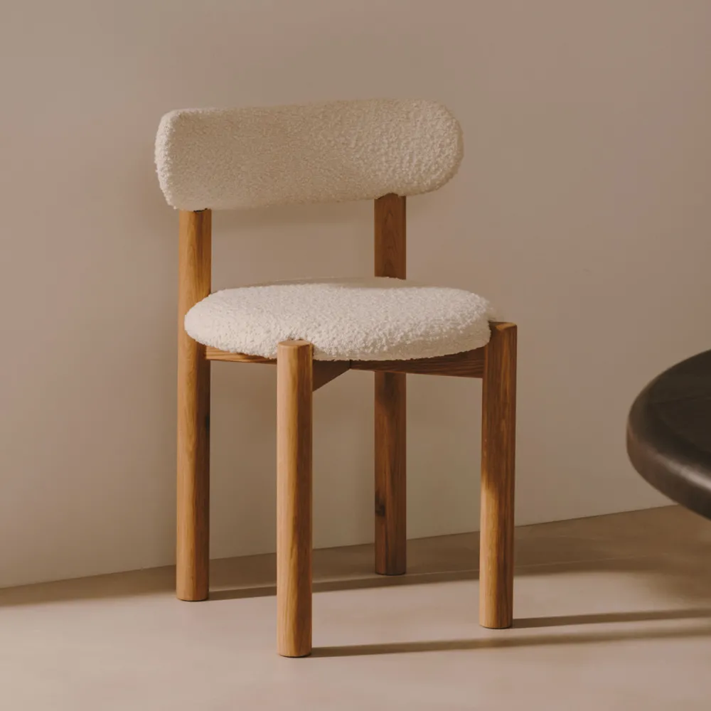 Massief eikenhout en schapenvacht, een trendy bekleding, komen samen voor maximaal comfort in de Nebai-stoel. Een ontwerp dat de stijl van je eetkamer naar een ander niveau brengt.