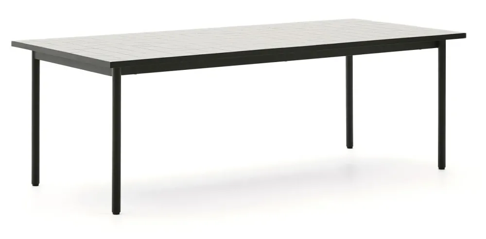 Deze tafel, exclusief ontworpen door Yonoh Studio voor Kave Home, vindt de mediterrane essentie opnieuw uit door middel van een eigentijdse en levendige benadering. Het blad bestaat uit een mozaïek van geometrische tegels en is een eerbetoon aan traditioneel vakmanschap: elke tegel is zorgvuldig met de hand geplaatst. De gegalvaniseerde stalen structuur voegt een modern tintje toe en is bestand tegen roest en corrosie, wat een hoge duurzaamheid garandeert. De plastic beschermers onder de poten beschermen elk type vloer, waardoor hij perfect is voor zowel binnen als buiten. Dit meubelstuk maakt deel uit van de Maurina collectie, die de schoonheid van traditionele materialen en vakmanschap combineert met eigentijdse lijnen, ideaal voor wie op zoek is naar een balans tussen tijdloos en eigentijds in huis.