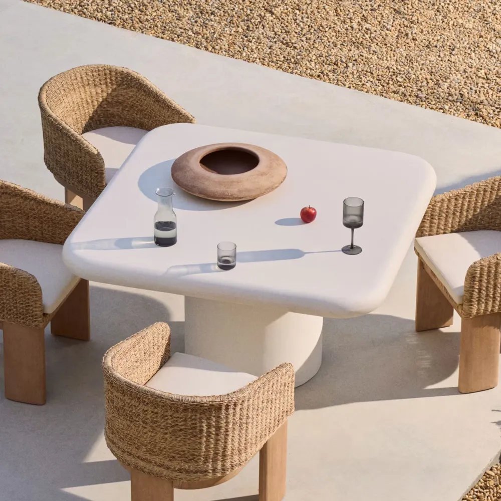 De Addaia tafel is een perfecte samensmelting van organisch design en hedendaagse functionaliteit, ontworpen om een uniek tintje te geven aan elke ruimte, zowel binnen als buiten. De esthetiek, gedefinieerd door afgeronde en zachte lijnen, roept een band op met de omgeving, terwijl het materiaal in wit GFRC, een innovatief soort lichtgewicht cement versterkt met glasvezel, uitzonderlijke weerstand biedt tegen de meest veeleisende klimatologische omstandigheden. Elke tafel is een uniek element, met tinten, texturen en porositeiten die het handgemaakte en exclusieve karakter benadrukken. De zeer fijne en gladde afwerking, vrijwel zonder poriën, voegt een luxe tactiele sensatie toe die contrasteert met de inherente stevigheid van cement. Hoewel het materiaal ontworpen is om bestand te zijn tegen weersinvloeden, kunnen de natuurlijke eigenschappen ervan na verloop van tijd microscheurtjes of subtiele onregelmatigheden veroorzaken, waardoor de authenticiteit wordt geaccentueerd zonder dat het afdoet aan de duurzaamheid. Om hem mooi te houden, is het raadzaam om hem in de herfst en winter te beschermen met een waterdichte hoes en twee keer per jaar Sterina steenbeschermer aan te brengen. Addaia is niet zomaar een tafel, het is een designelement dat elke ruimte transformeert met zijn organische en eigentijdse persoonlijkheid.