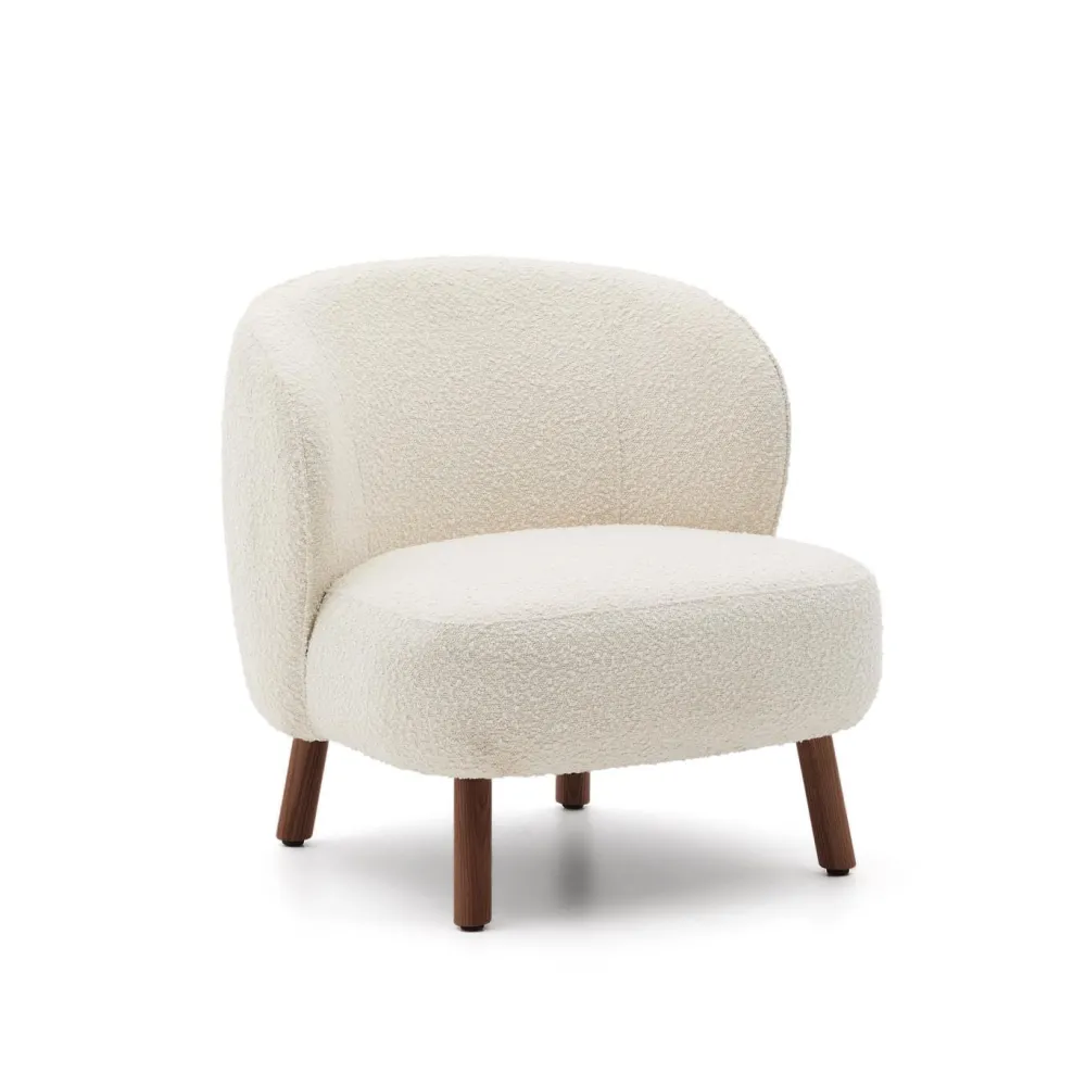 - Fauteuil bekleed met bouclé dat warm aanvoelt.