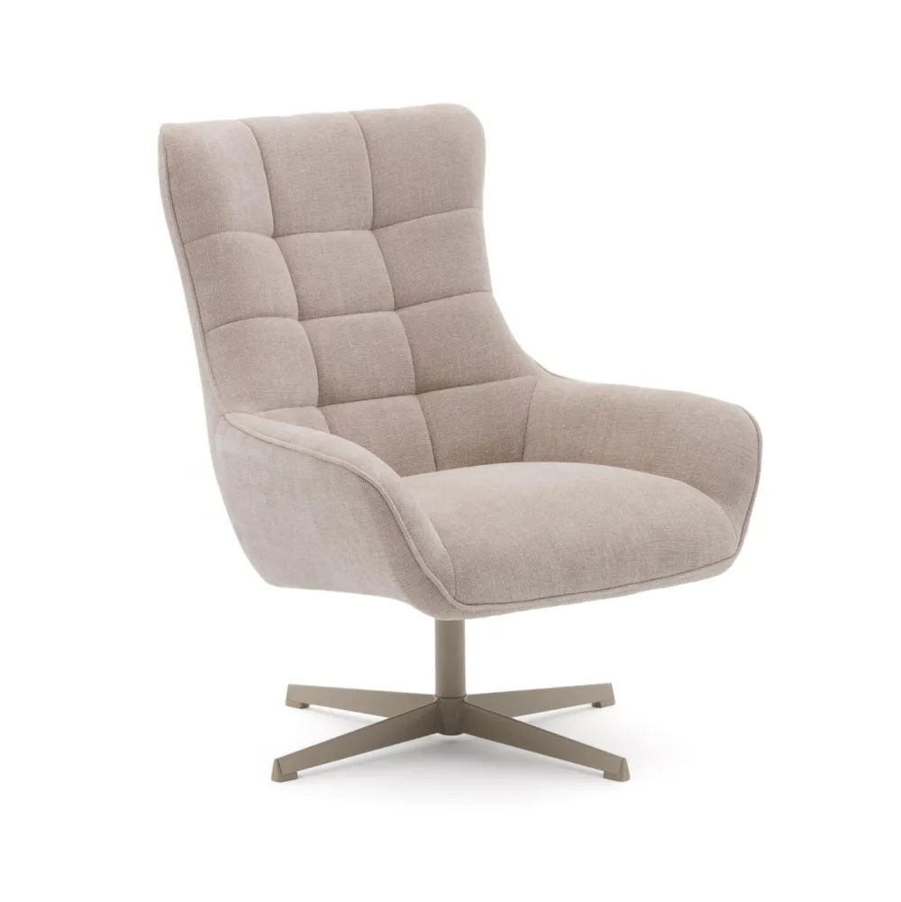 - Draaifauteuil met gevoerde armleuningen bekleed met chenille stof met lichte structuur en zachte touch in de kleur beige.