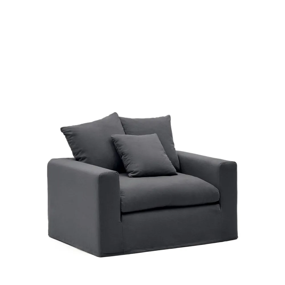 - Fauteuil met afneembare hoes van ademend, gestructureerd katoen en linnen met een gesanforiseerde afwerking, waardoor de hoes zijn oorspronkelijke grootte en vorm behoudt.