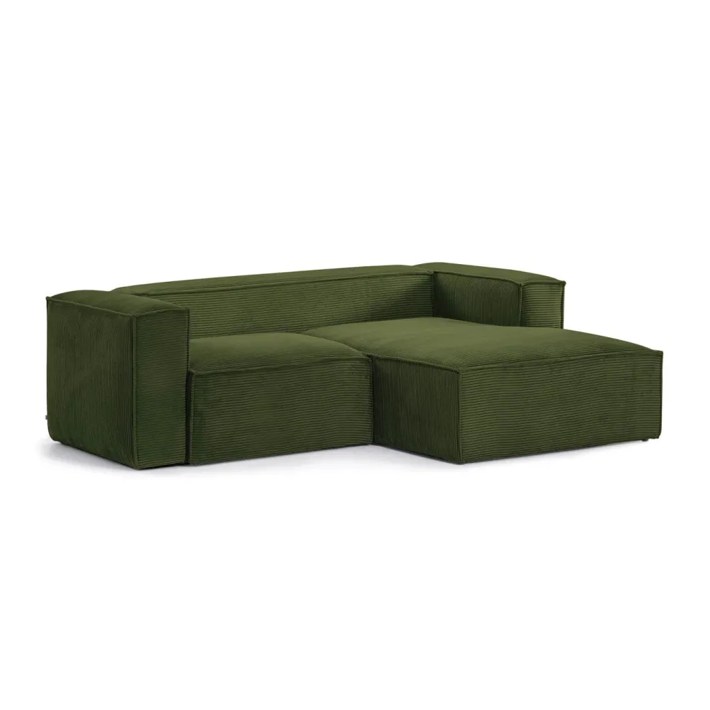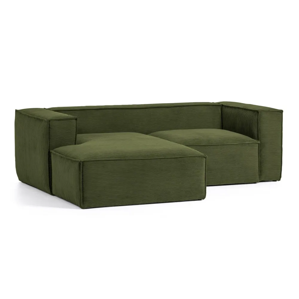 - 2-zitsbank met chaise longue bekleed met dik ribfluweel dat zeer zacht aanvoelt en een hoge weerstand heeft.