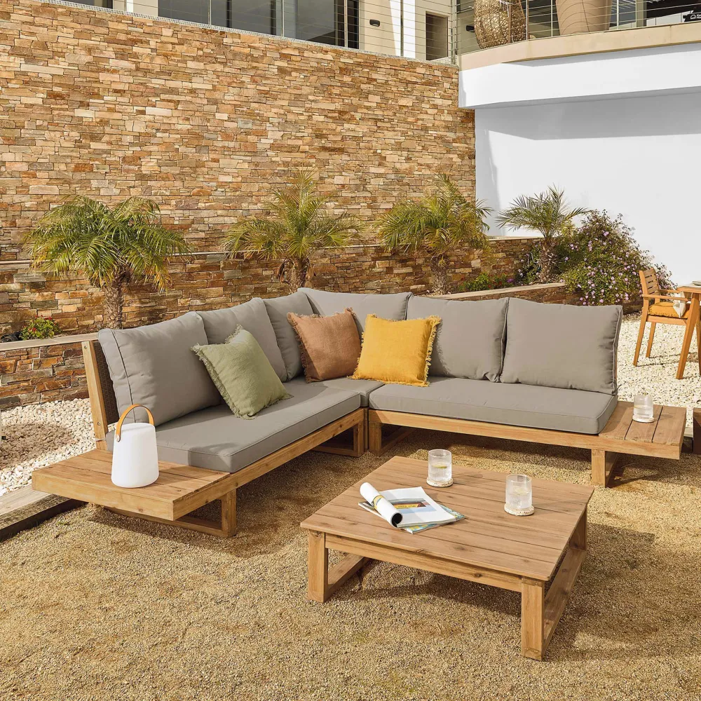 Creëer een buitenlounge om in te ontspannen met deze hoekbank, gemaakt van duurzaam hout, met genoeg ruimte om te genieten in goed gezelschap. Profiteer van de bijzettafels aan de uiteinden voor je zomerse cocktails.