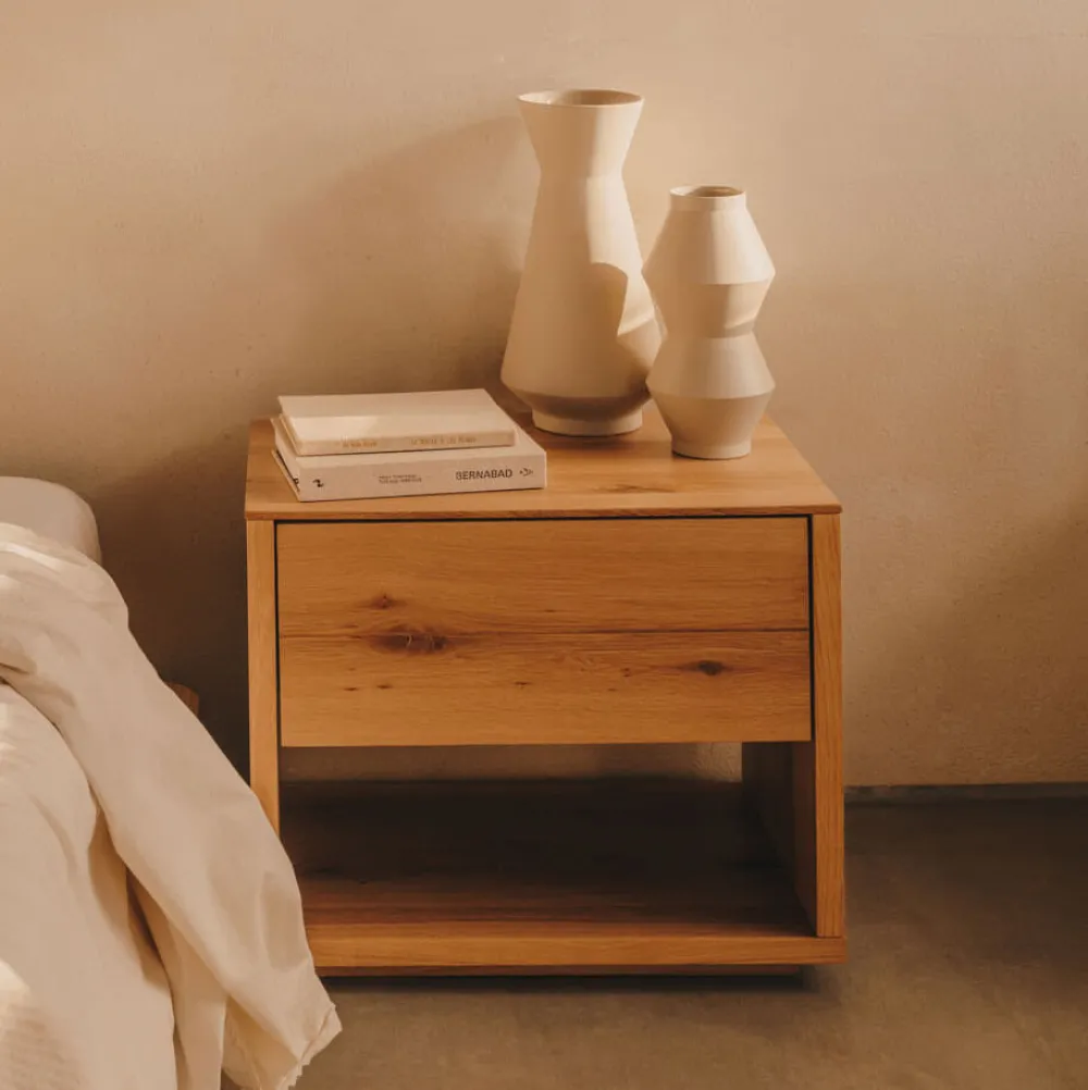 - Nachtkastje in eikenfineer met natuurlijke afwerking.