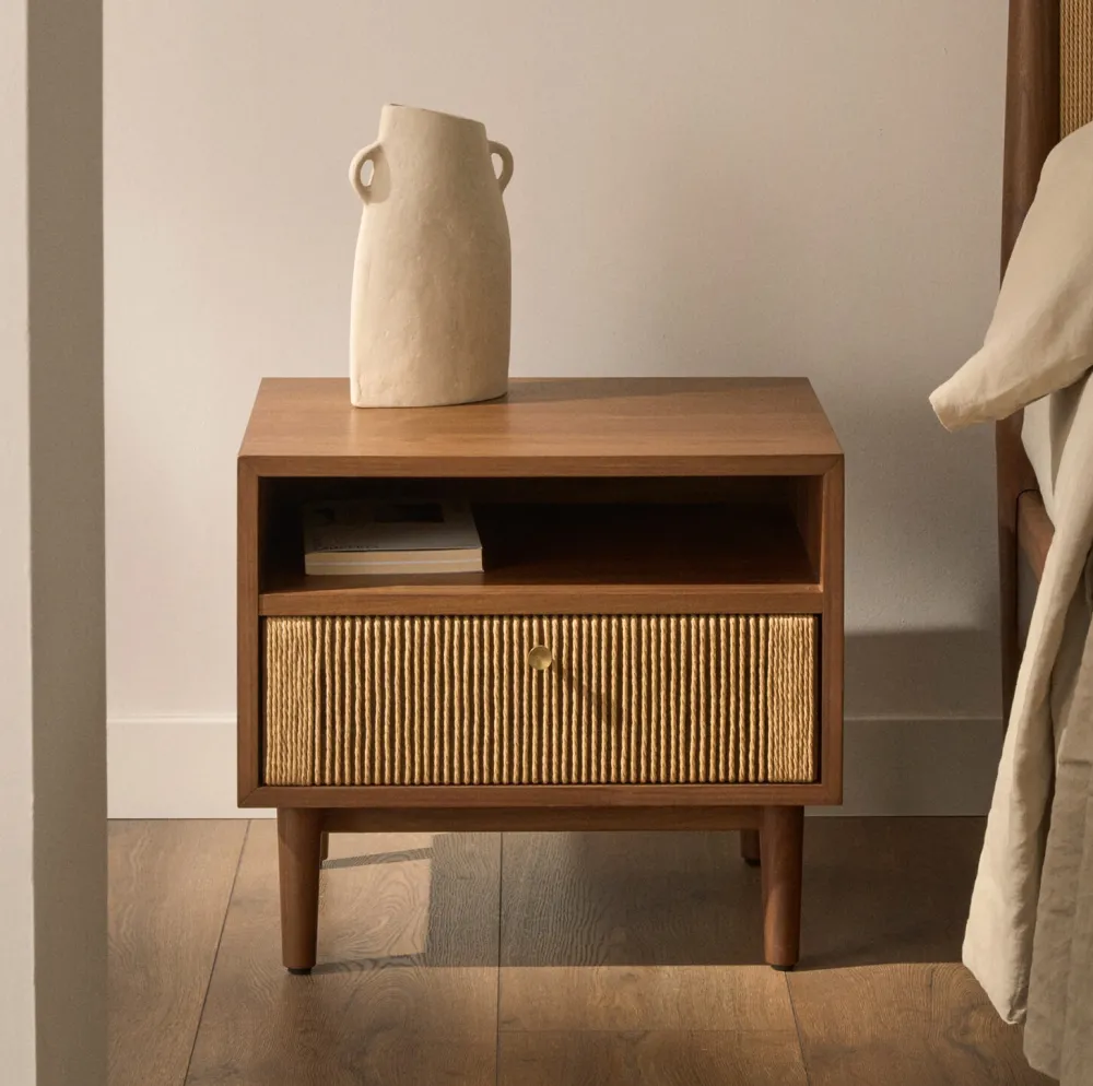 Met zijn tijdloze essentie combineert Elan de warmte van notenhout met een strak design. Elk meubelstuk is een staaltje vakmanschap, waarbij de details van handgeweven touw een vleugje elegantie en rustiek karakter toevoegen aan je interieur.