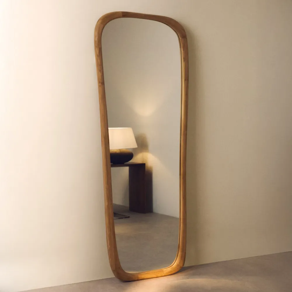 Deze organisch gevormde spiegel van teakhout valt op door zijn vloeiende en elegante ontwerp. Het unieke silhouet brengt dynamiek en persoonlijkheid in elke ruimte, waardoor het een decoratief element is dat functionaliteit en esthetiek in evenwicht brengt. Perfect als aanvulling op moderne of warmere interieurs, voegt deze spiegel overal in huis karakter en originaliteit toe.
