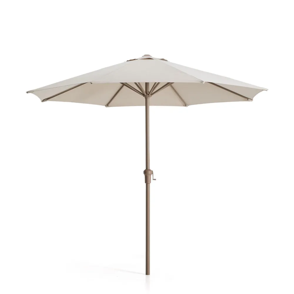 De Milna parasol biedt een ruime en stabiele schaduw om in alle rust van het buitenleven te genieten. De centrale paal en baleinen van staal zorgen voor stevigheid en een goede balans, met een lichtgewicht ontwerp dat zich gemakkelijk aanpast aan terrassen en tuinen. Hij opent en sluit eenvoudig met een handslinger, met een soepele beweging. De polyester stof, met een gewicht van 200 g/m², beschikt over UV50+-bescherming en blokkeert tot 98% van de ultraviolette straling. Om hem in goede staat te houden, raden we aan hem af te dekken met de Iria hoes wanneer hij niet wordt gebruikt. De voet is niet inbegrepen.
