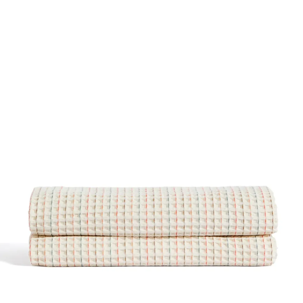Deze sprei voor een meegroeiledikant is gemaakt van 100% katoen, wat garant staat voor een zachte en aangename textuur, ideaal voor dagelijks comfort. Het wafeldessin is gecombineerd met veelkleurige strepen, wat een frisse en vrolijke uitstraling geeft aan de slaapkamer. Deze sprei is gemaakt in Portugal, een land dat bekend staat om zijn traditie in de productie van textiel van hoge kwaliteit en biedt stevigheid en duurzaamheid, maar ook ademend vermogen en gemakkelijk onderhoud. Een veelzijdig en functioneel product, perfect om de sfeer van elke kinder- of jongerenkamer te vernieuwen.