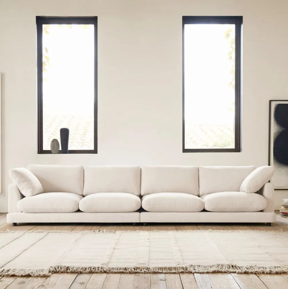 - Zacht zitcomfort dankzij de kussens die zijn gevuld met nieuwe vezels met donseffect en 100% siliconen, en een schuimkern met een dichtheid van 30kg/m3. De zittingen, rugleuningen en kussens hebben afneembare hoezen en zijn omkeerbaar.