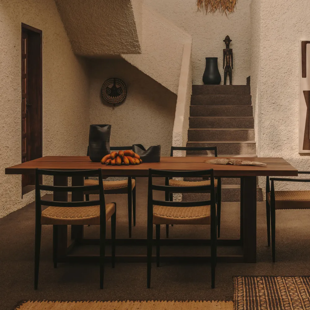 - Tafel Sashi van massief teakhout met geborsteld effect.