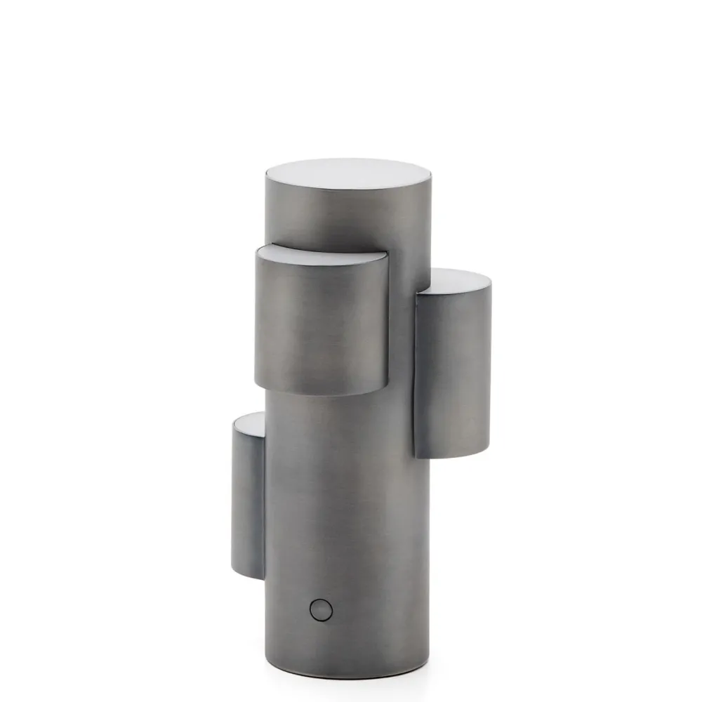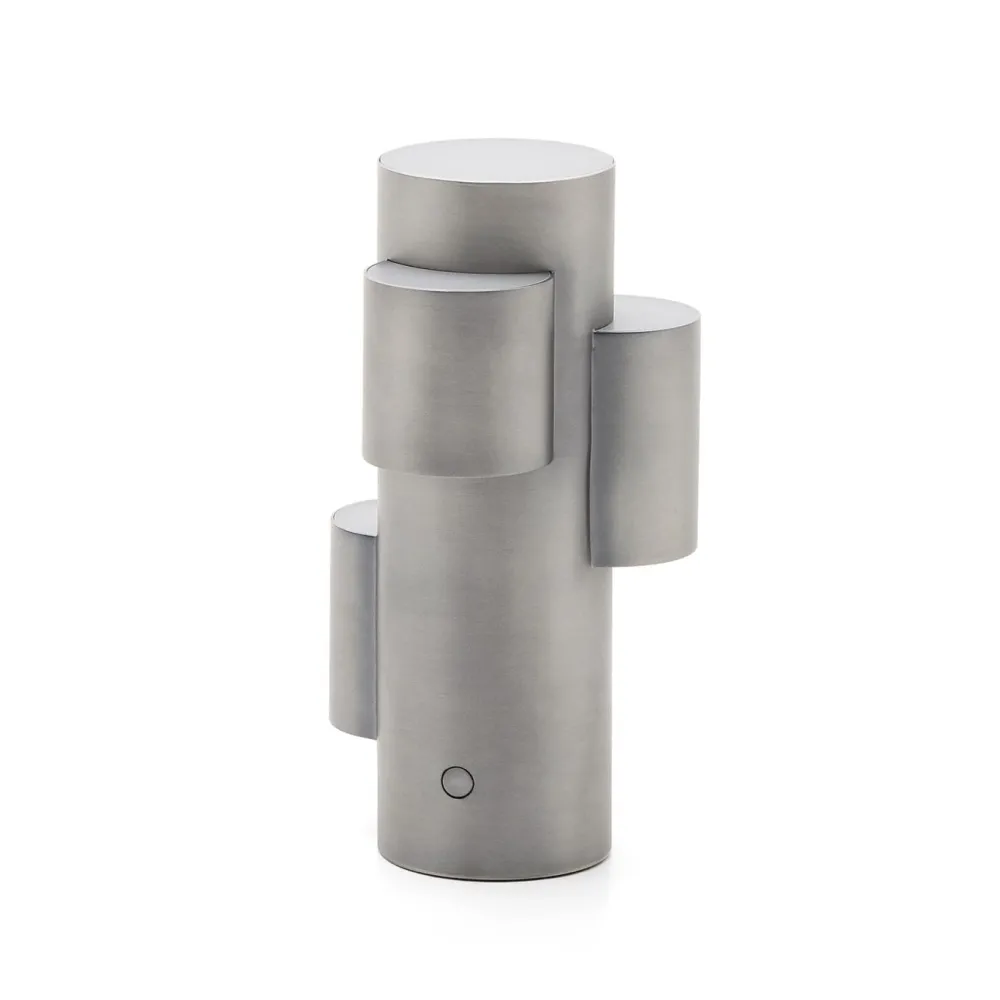 - Draagbare led-tafellamp van grijs metaal met geborstelde afwerking.
