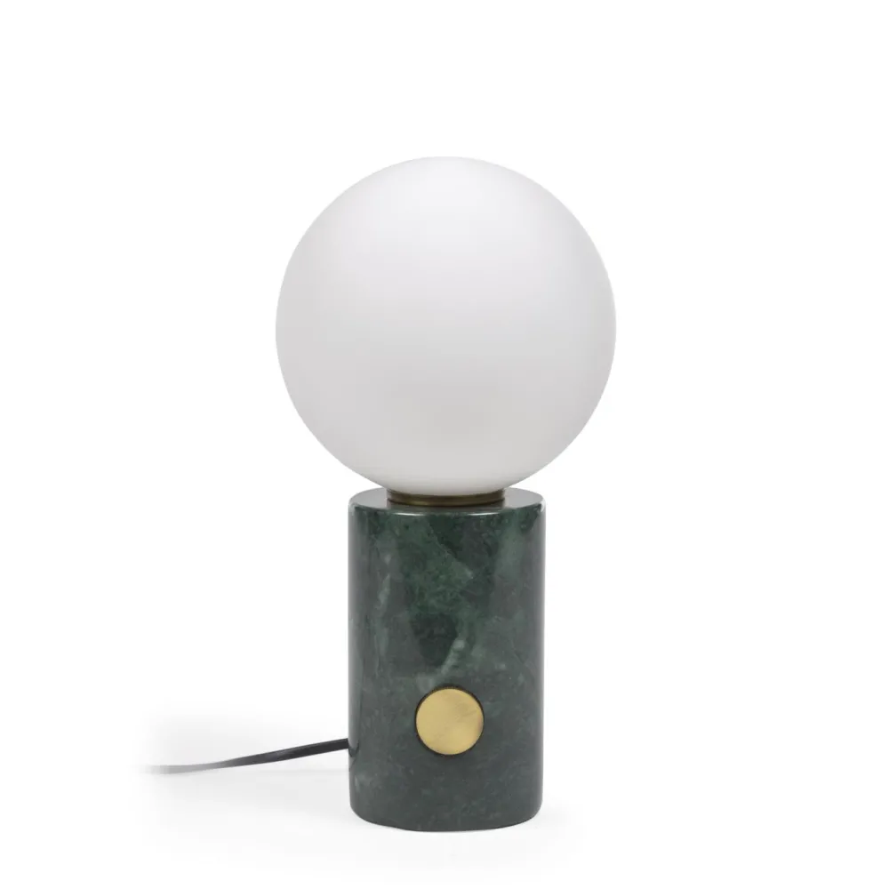 De lampencollectie Phant valt op door zijn bolvormige matglazen kap bevestigd aan een marmeren voet met een groene afwerking. Een ontwerp dat op zichzelf schittert.