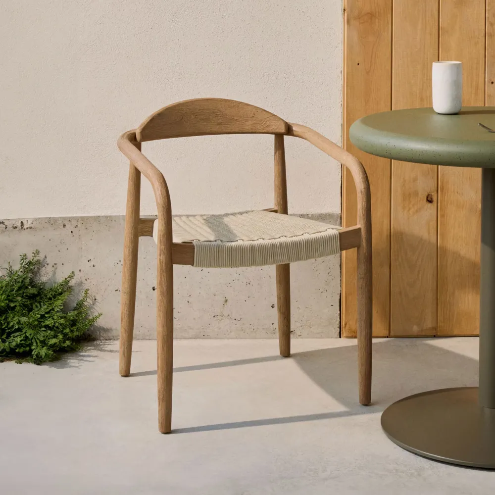 De Nina stoel is een expressie van warm en authentiek design. De structuur van massief acaciahout, met een natuurlijke afwerking die de unieke nerven en tinten benadrukt, maakt elke stoel uniek. Dit ontwerp weerspiegelt een toewijding aan duurzaamheid, aangezien het gebruikte hout 100% FSC™-gecertificeerd is, met een garantie voor een verantwoord bosbeheermodel. De zitting, gemaakt van UV-bestendig, handgeweven touw, voegt niet alleen een uniek decoratief tintje toe, maar biedt ook stevigheid en comfort. Met zijn veelzijdige ontwerp is de Nina stoel geschikt voor zowel binnen als buiten en past hij stijlvol in elke ruimte. Bovendien maken de stapelbare functionaliteit en ingebouwde armleuningen de stoel tot een praktische keuze zonder afbreuk te doen aan elegantie.