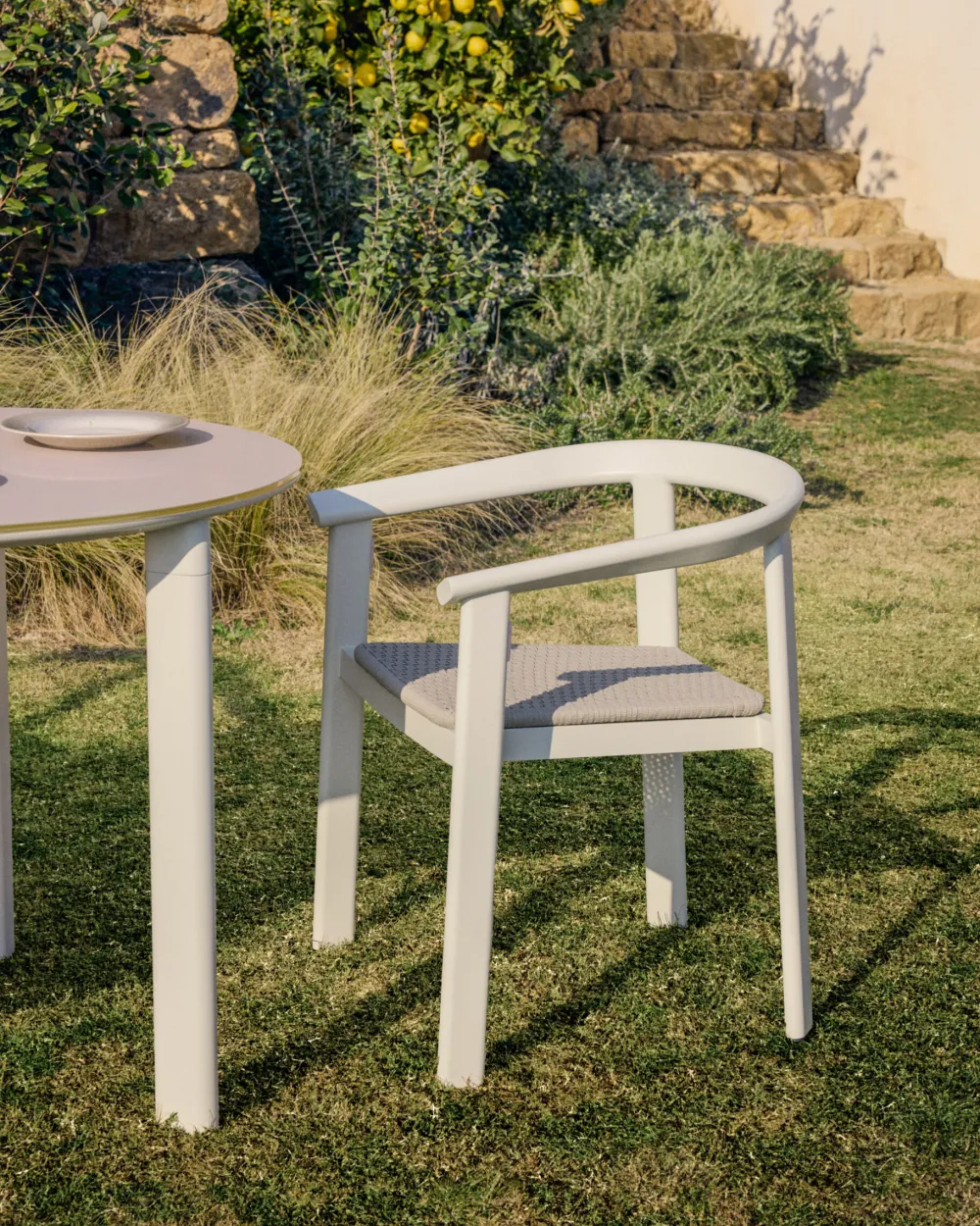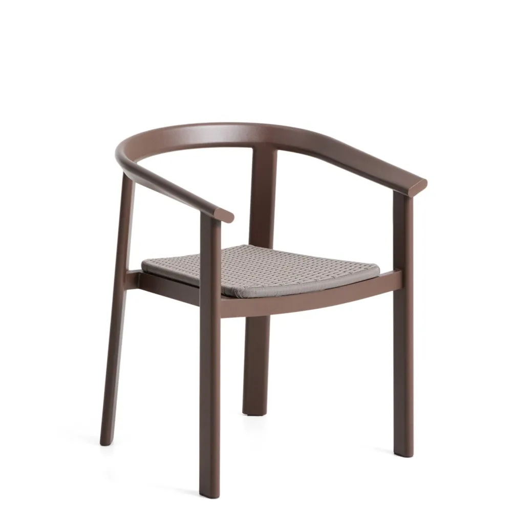 De Erice stoel heeft armleuningen en een structuur van aluminium, een lichtgewicht en duurzaam materiaal. De zitting van handgevlochten touw voegt textuur toe en heeft een UV-bestendige behandeling ondergaan, zodat hij er ook na verloop van tijd goed blijft uitzien. De aluminium structuur is zeer goed bestand tegen roest, corrosie en UV-straling, waardoor hij 100% geschikt is voor buitengebruik. Een functioneel en duurzaam meubel, ontworpen voor zowel binnen- als buitenruimtes.