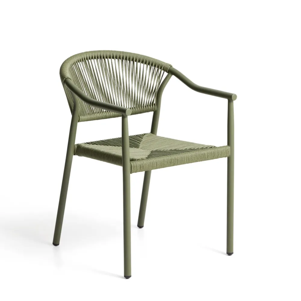 De Livadia stoel is een veelzijdig en tijdloos meubel, ontworpen voor zowel binnen als buiten. De aluminium structuur combineert lichtheid en sterkte, waardoor de stoel er goed blijft uitzien en bestand is tegen roest, corrosie en UV-stralen. De rugleuning en zitting zijn van handgevlochten synthetisch touw, wat zorgt voor textuur en comfort. Door het stapelbare ontwerp kan hij eenvoudig worden opgeborgen als hij niet wordt gebruikt en de beschermers onder de poten helpen de vloer te beschermen.