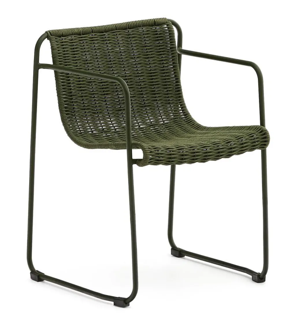 Deze stoel, exclusief ontworpen door Yonoh Studio voor Kave Home, vindt de mediterrane essentie opnieuw door middel van een eigentijdse en levendige benadering. Door de gegalvaniseerde stalen structuur onderscheidt hij zich door zijn duurzaamheid dankzij de weerstand tegen roest en corrosie en zijn vermogen om te passen in alle soorten buitenruimtes. De zitting en rugleuning, gemaakt van handgeweven, UV-bestendig touw en bevestigd aan een buizenstructuur, bieden comfort en een unieke stijl. Het slede-ontwerp en de royale zitmaten zorgen voor een ongeëvenaarde comfortabele ervaring. Dit meubel maakt deel uit van de Maurina collectie, die de schoonheid van traditionele materialen en vakmanschap combineert met eigentijdse lijnen, ideaal voor diegenen die een balans zoeken tussen tijdloos en eigentijds in hun huis.