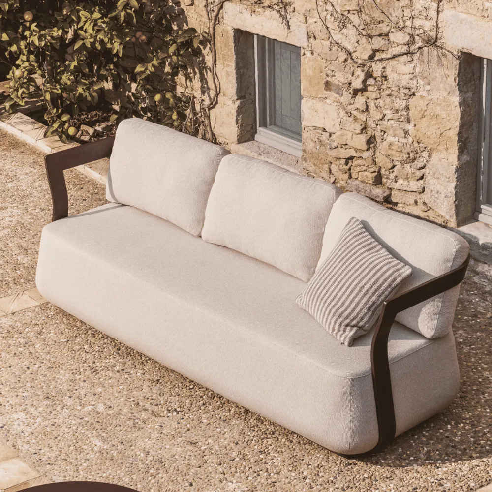 De Tamaris bank combineert comfort en degelijkheid in een ontwerp met omhullende lijnen dat uitnodigt om te ontspannen en is ontworpen om zowel binnen als buiten te worden gebruikt. Het aluminium frame is licht en sterk, met een gedefinieerde contour die de zitting en rugleuning stevig ondersteunt. De zit- en rugkussens zijn bekleed met een waterafstotende stof die absorptie voorkomt en drogen vergemakkelijkt. Bovendien is het kussen van de rugleuning verwijderbaar, voor meer veelzijdigheid en comfort. De poten zijn voorzien van vloerbeschermers.